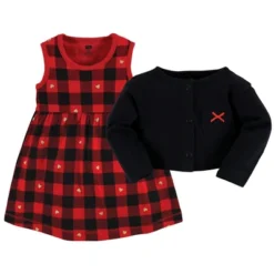 Hudson Baby Baby Girls Cotton Dress And Cardigan Set, Gold Heart Buffalo Plaid