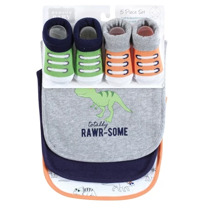 Hudson Baby bib and socks set are an adorable accessory set for fashionable matching bibs and socks. Each set features three bibs and two socks made with coordinating fun, stylish prints. Our accessory set is a great baby shower gift.