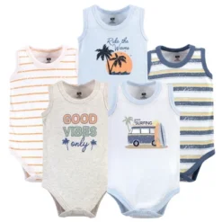 Hudson Baby sleeveless bodysuits are an essential part of baby’s wardrobe. Our bodysuits feature adorable prints, embroideries, stripes and solids and provide a comfortable base layer that’s great for pairing with pants, shorts, or even wearing under outfits. Our bodysuits are comfortable and cozy for all-day, everyday wear for your little one. Hudson Baby Infant Boy Cotton Sleeveless Bodysuits 5pk, Gone Surfing is a great baby essentials set for your little one.