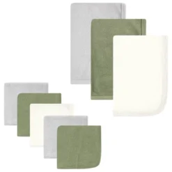 - Set includes two bodysuits, two pants, five bibs, four caps, three burp cloths, three scratch mittens, five washcloths, and one laundry bag