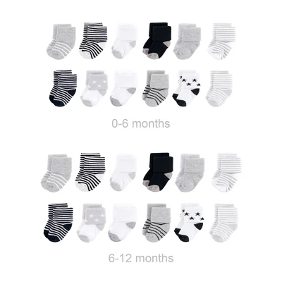 Hudson Baby terry socks are soft, snuggly, warm socks to keep baby’s feet feeling cozy and comfortable. The fold-over cuff style make it easier to keep baby’s socks on their feet. Our super soft cotton blend socks are gentle and are made with thick, cushiony fabric to keep baby’s feet warm and snug. Our grow with me sets are perfect if you are looking to buy a bundle pack of socks for your baby’s first full year. Set includes socks in 0-6 months and 6-12 months.